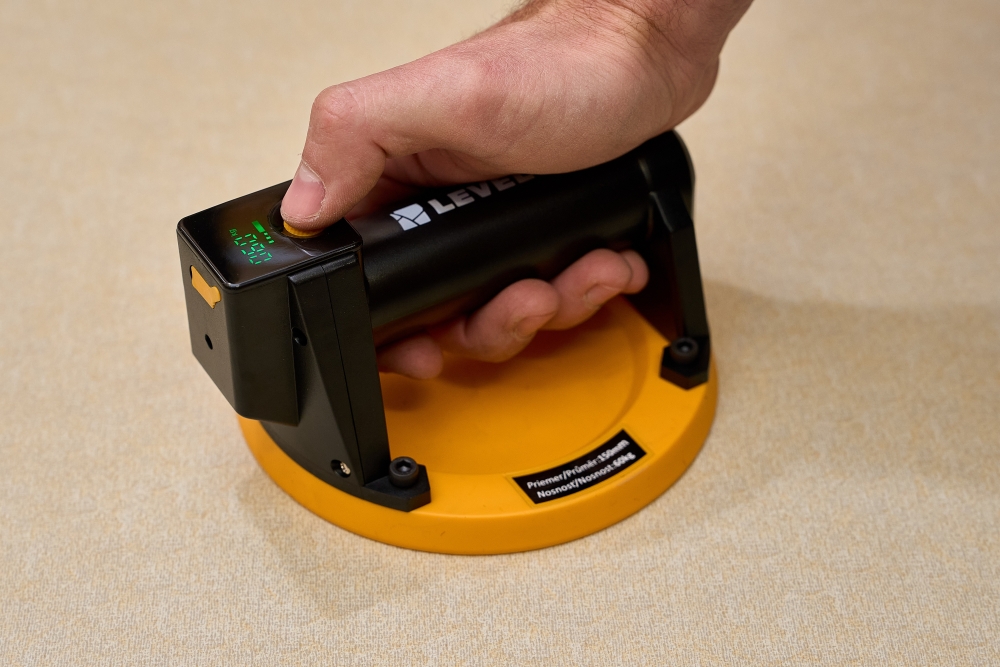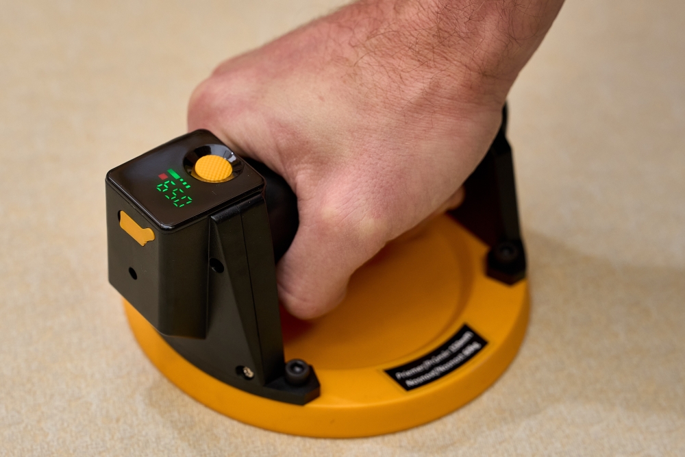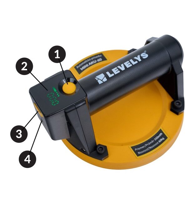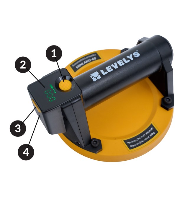 Prísavku položte na čistý a suchý povrch materiálu. Jemne pritlačte prísavku k povrchu a stlačte tlačidlo 1, čím aktivujete sací proces prístroj začne vytvárať podtlak. Keď tlak dosiahne nastavenú hodnotu, čerpadlo sa automaticky zastaví .